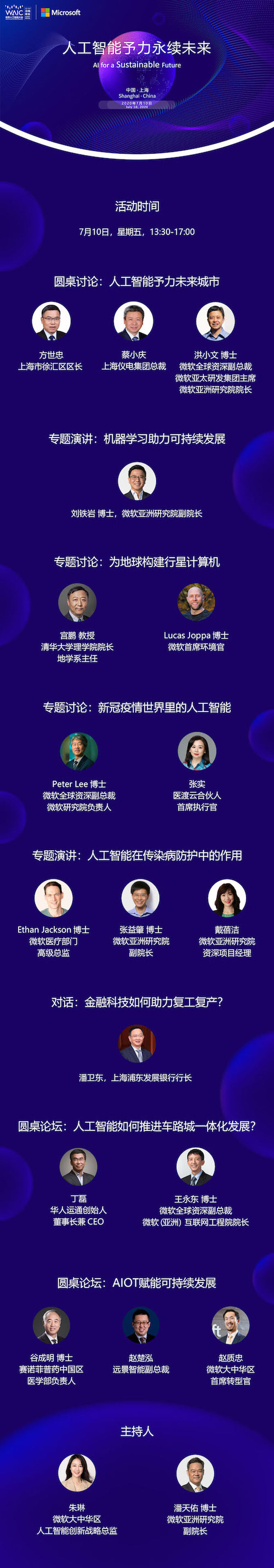 2020世界人工智能大会云端峰会(WAIC 2020)开幕在即,作为大会战略合作伙伴,微软将于7月10日下午在线举办“人工智能予力永续未来”微软论坛,与国内外行业专家、学者和商业领袖一起围绕AI 在城市建设、传染病防护、节能减排等多个领域的应用,探讨前沿科技如何推进整个社会的可持续发展。想深度了解AI 技术将如何助力人类健康,不要错过这场激荡思想的云端盛会!!请查看下方海报,了解嘉宾阵容、详细日程及注册方式。