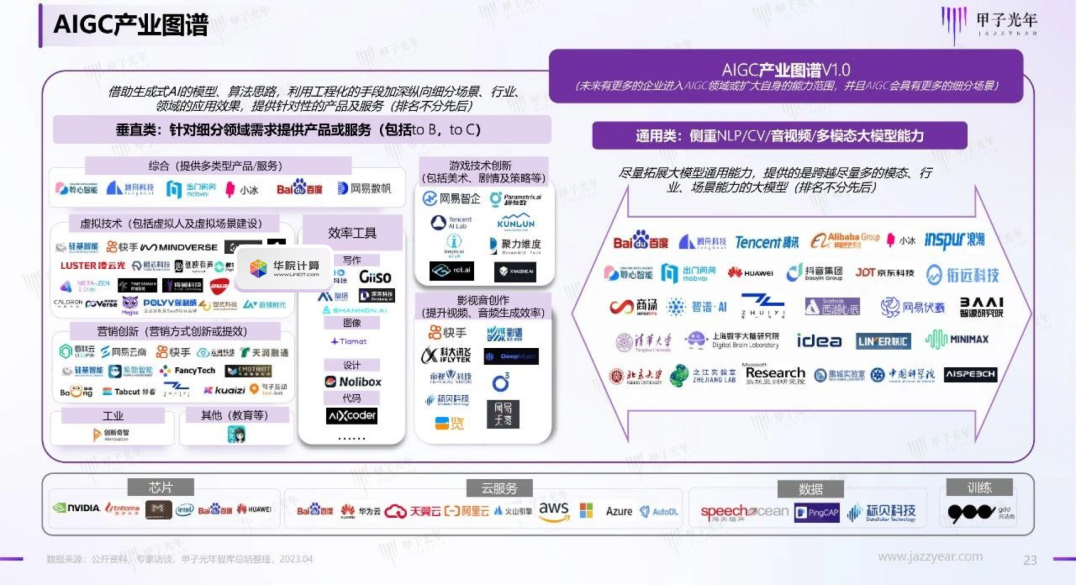 4月,中国科技产业智库甲子光年发布《AIGC应用与实践研究展望报告》及AIGC产业图谱,面向AIGC技术创新者、产业参与者、资本机构和政府等各方展现AIGC产业的整体生态环境和行业发展。华院数智人凭借其在生成式AI技术、人机交互能力和市场应用优势入选该图谱,通过标准化产品及定制化方案,为不同细分场景、行业、领域提供包括交互式智能终端、虚拟直播平台和智能视频生成平台等产品及服务。