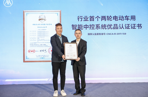 论坛上,凭借智能技术的领先优势,爱玛荣获中国电研 CVC威凯权威检测机构颁发“两轮电动车用智能中控系统优品认证证书”。