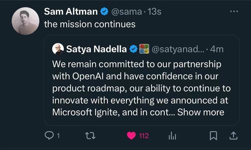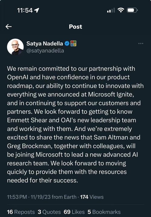 北京时间11月20日,微软公司CEO、董事长萨提亚·纳德拉(SatyaNadella)发文表示前任OpenAI创始人兼CEO山姆·奥特曼(SamAltman)与前任OpenAI联合创始人兼总裁联合创始人格雷格·布罗克曼(GregBrockman)及他们的同事们,将加入微软,领导新的先进人工智能研究团队。