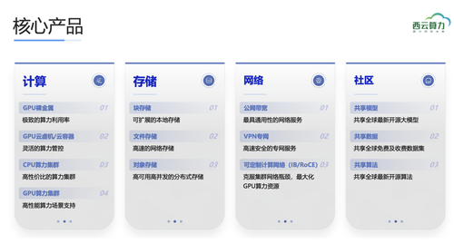 紧接着,梁峰转向了存储产品。他特别指出,在AI训练过程中,高速并行的存储服务显得尤为关键,直接影响模型训练的性能表现。因此,西云算力推出了X-GPFS等高速存储解决方案,以满足用户在数据处理和分析方面的迫切需求。同时,为了满足不同场景的需求,公司还提供了全闪存储服务和对象存储,为客户提供了更加灵活和全面的存储选择。