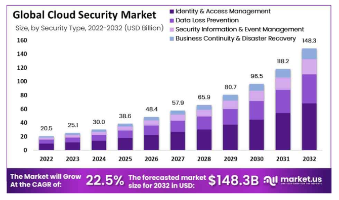 到2032年,全球云安全市场规模预计将达到1483亿美元,2022年至2032年的复合年增长率将达到22.5%,而2022年云安全市场规模为205亿美元。