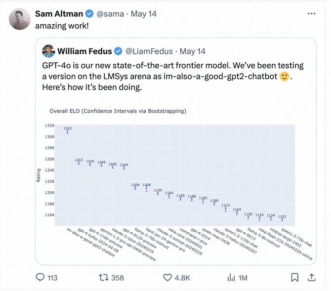 上周,一个名为“im-also-a-good-gpt2-chatbot”的神秘模型突然现身大模型竞技场Chatbot Arena,排名直接超过GPT-4-Turbo、Gemini 1 .5 Pro、Claude 3 0pus、Llama-3-70b等各家国际大厂的当家基座模型。随后OpenAI揭开“im-also-a-good-gpt2-chatbot”神秘面纱——正是GPT-4o的测试版本,OpenAI CEO Sam Altman也在Gpt-4o发布后亲自转帖引用 LMSYS arena 盲测擂台的测试结果。