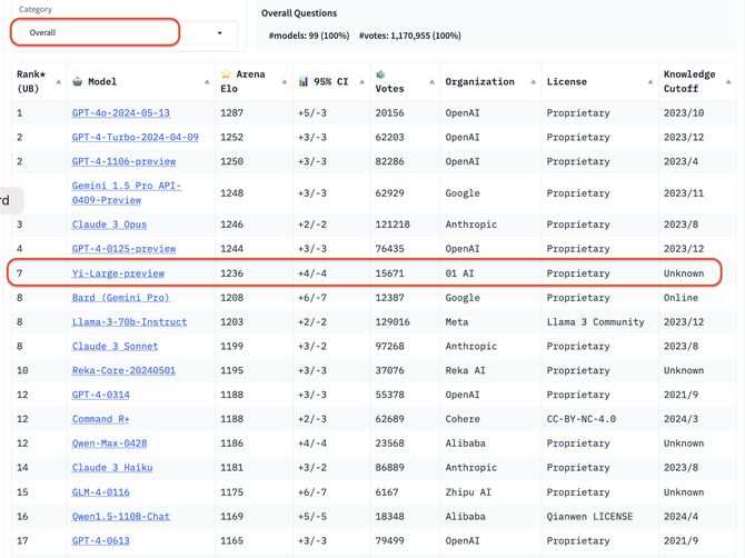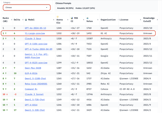 LMSYS 中文榜:GPT-4o 和 Yi-Large 并列第一