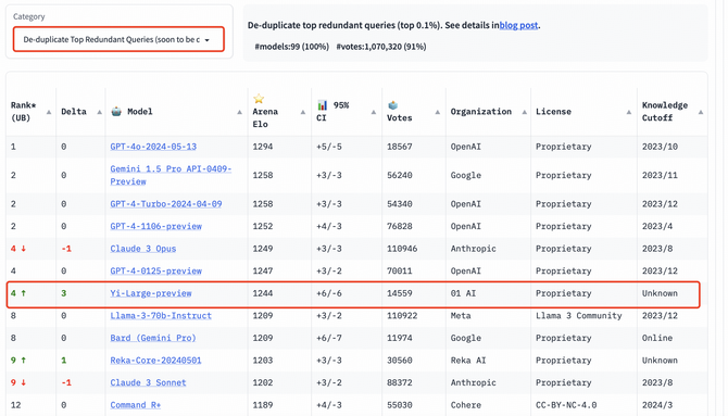 在去除冗余查询后的总榜中, Yi-Large的Elo得分更进一步,与Claude 3 Opus、GPT-4-0125-preview并列第四。