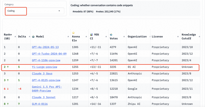 在编程能力(Coding)排行榜上,Yi-Large 的Elo分数超过Anthropic 当家旗舰模型 Claude 3 Opus,仅低于GPT-4o,与GPT-4-Turbo、GPT-4并列第二。