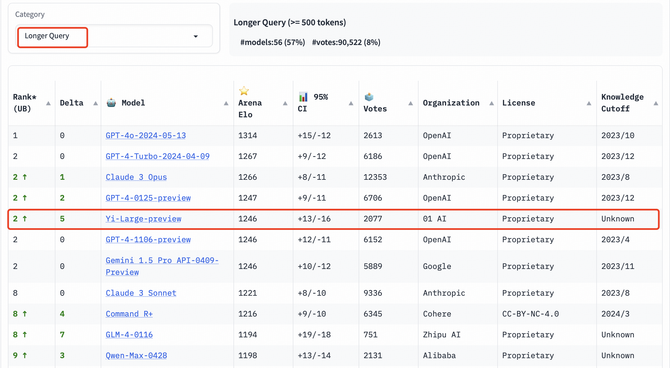 长提问(Longer Query)榜单上,Yi-Large同样位列全球第二,与GPT-4-Turbo、GPT-4、Claude 3 Opus并列。