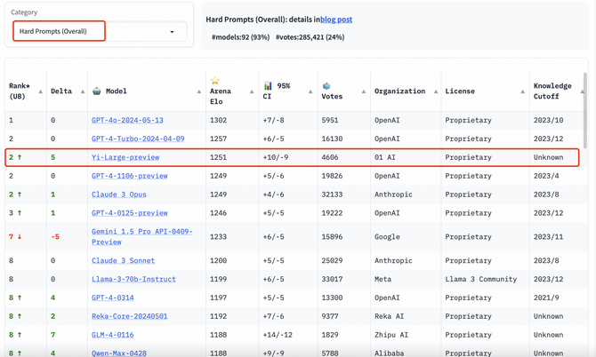 时隔一周,在最新更新的排名中,类“im-also-a-good-gpt2-chatbot”的黑马故事再次上演,这次排名飞速上涨的模型正是由中国大模型公司零一万物提交的“Yi-Large” 千亿参数闭源大模型。