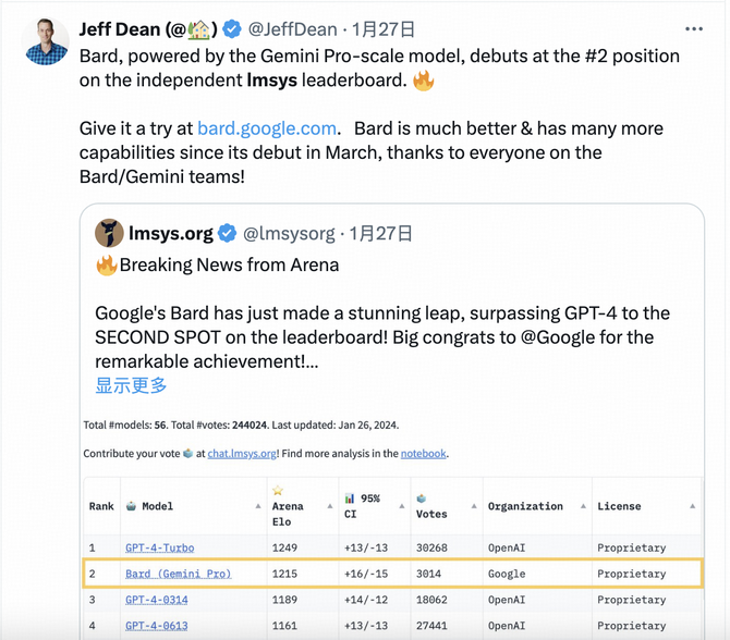 在海外大厂高管中,不只Sam Altman,Google DeepMind首席科学家Jeff Dean也曾引用LMSYS Chatbot Arena的排名数据,来佐证Bard产品的性能。
