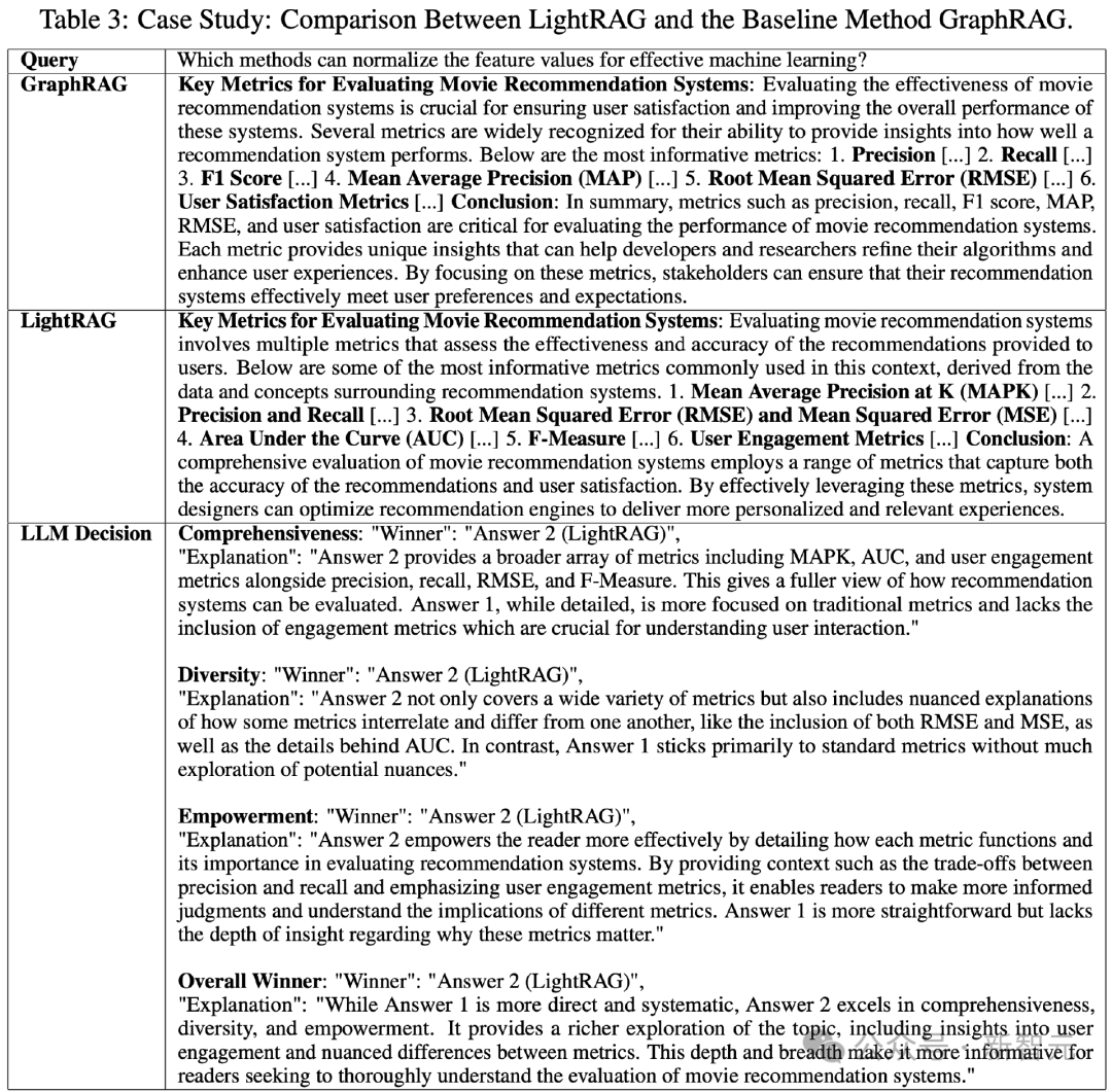 这主要归功于LightRAG的双层检索策略,它能够从低级别(具体细节)和高级别(宏观主题)两个层次全面检索信息,充分利用基于图的文本索引,捕获查询的完整上下文,从而生成更为丰富的回答。