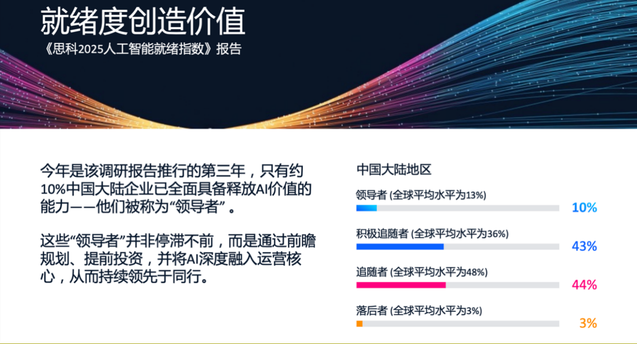 2025年10月15日,思科发布第三份年度《人工智能就绪指数》报告,直面全球企业在人工智能浪潮中的真实处境。报告指出,尽管绝大多数企业已意识到AI的战略紧迫性,但仅有约13%的全球企业及10%的中国大陆企业被归类为“领导者”——这些企业已全面具备释放AI价值的能力。与此同时,一种被称为“AI基础设施债务”的隐性风险正悄然累积,成为制约多数企业将AI雄心转化为实际价值的关键瓶颈。