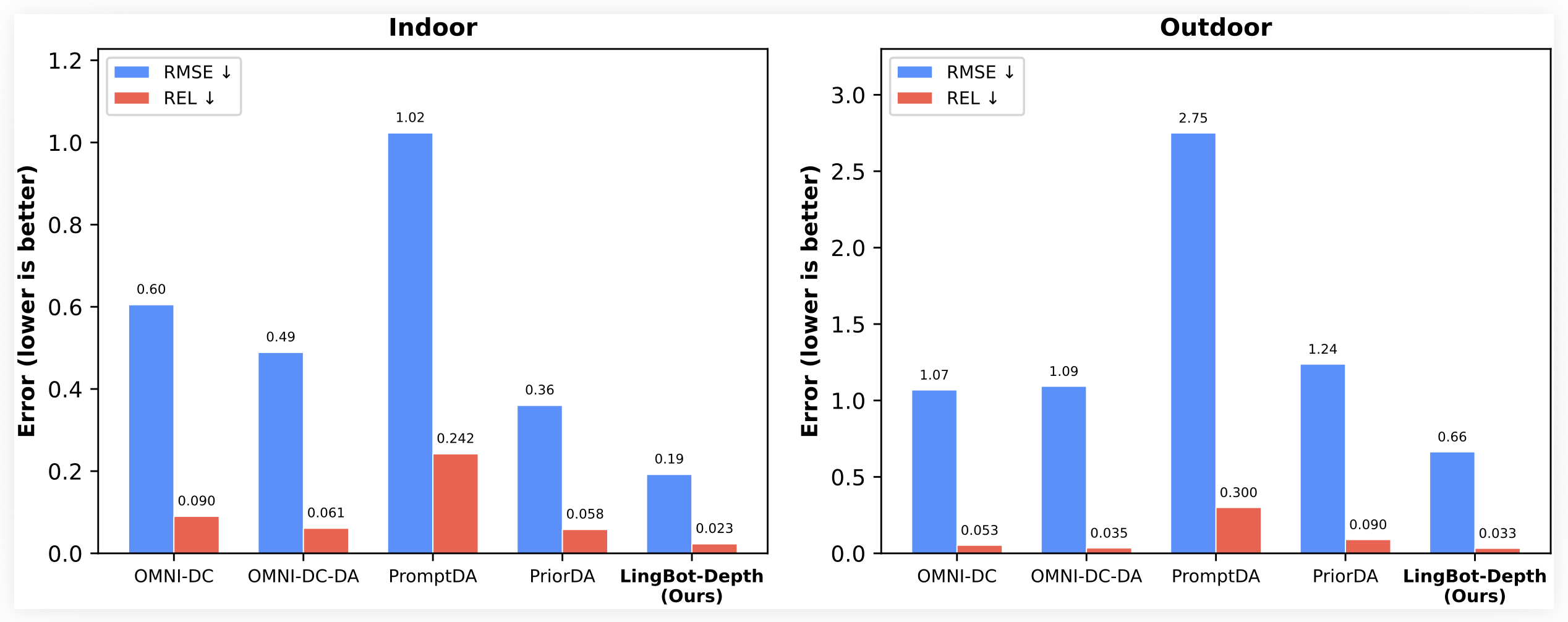 (在最具挑战的稀疏深度补全任务中,LingBot-Depth性能整体优于现有多种主流模型。图中数值越低代表性能越好。)