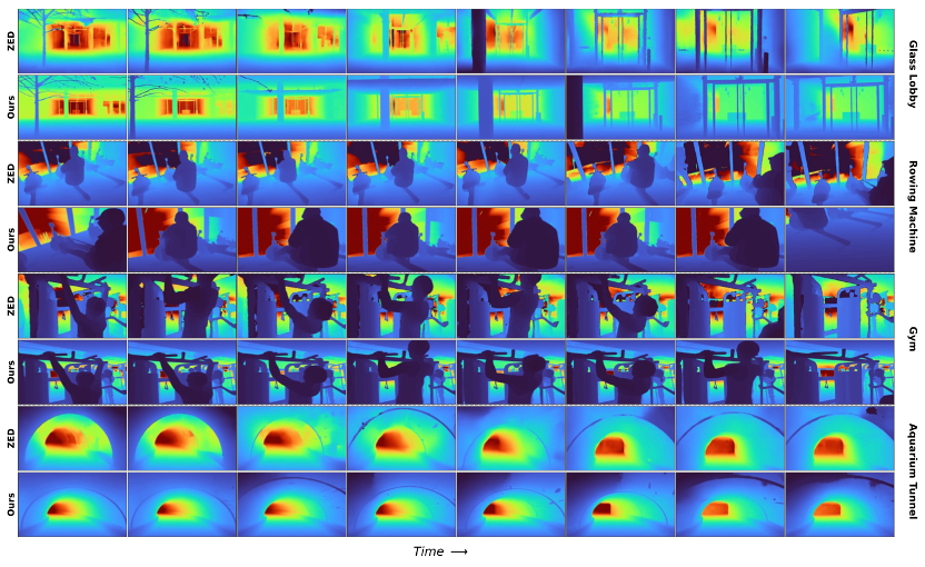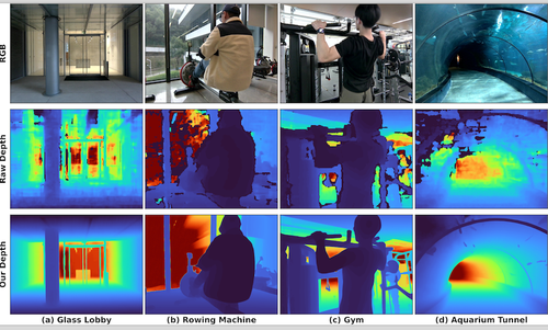 实验中,奥比中光 Gemini 330 系列在应用LingBot-Depth 后,面对透明玻璃、高反光镜面、强逆光及复杂曲面等极具挑战的光学场景时,输出的深度图依然平滑、完整,且物体的轮廓边缘非常锐利,其效果显著优于业内领先的3D 视觉公司 Stereolabs 推出的 ZED Stereo Depth 深度相机。这意味着在不更换传感器硬件的前提下,LingBot-Depth 可显著提升消费级深度相机对高难物体的处理效果。
