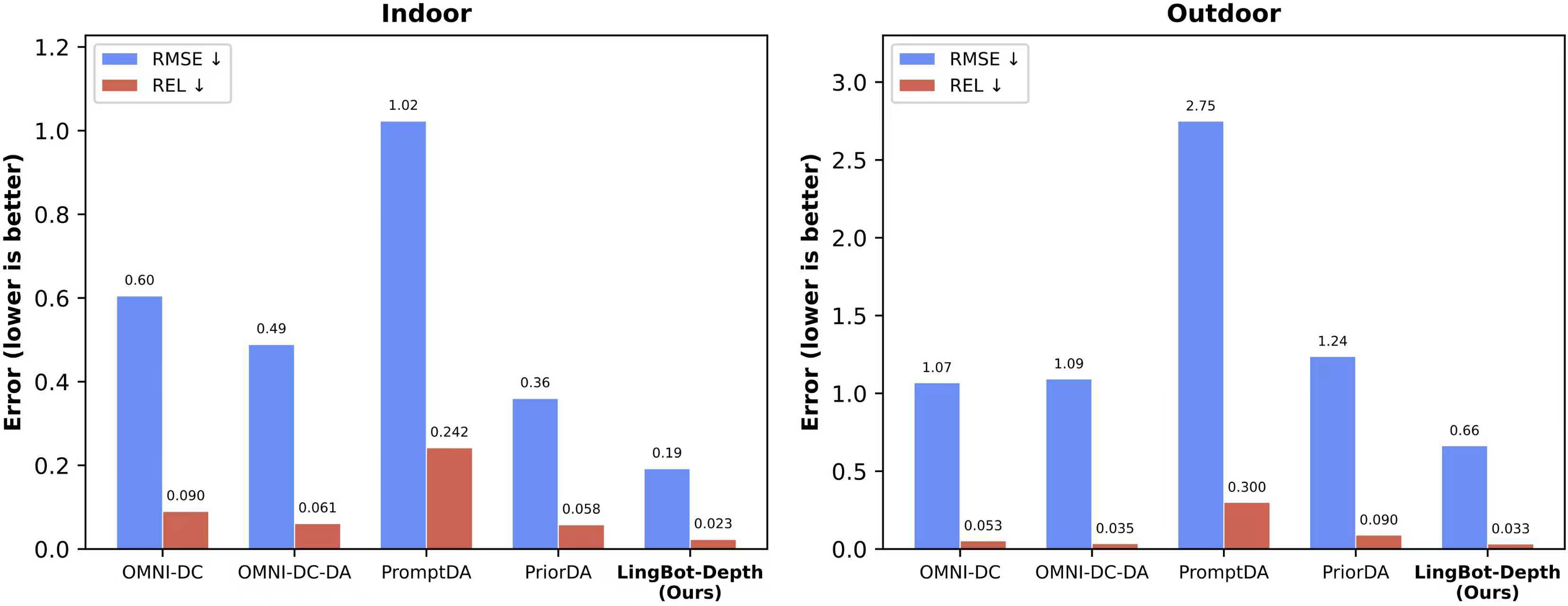 (在最具挑战的稀疏深度补全任务中,LingBot-Depth性能整体优于现有多种主流模型。图中数值越低代表性能越好。)