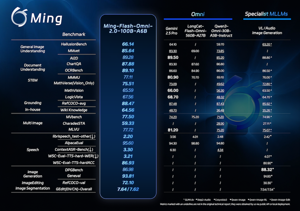 (图说:Ming-Flash-Omni-2.0 在视觉语言理解、语音可控生成、图像生成与编辑等核心领域实测表现均已达到开源领先水准)