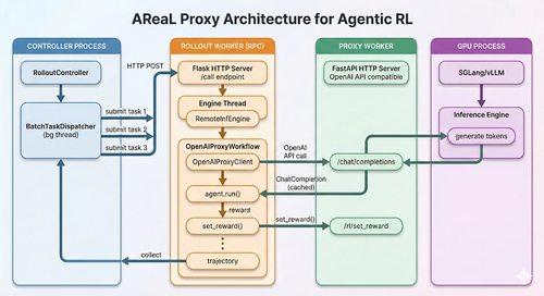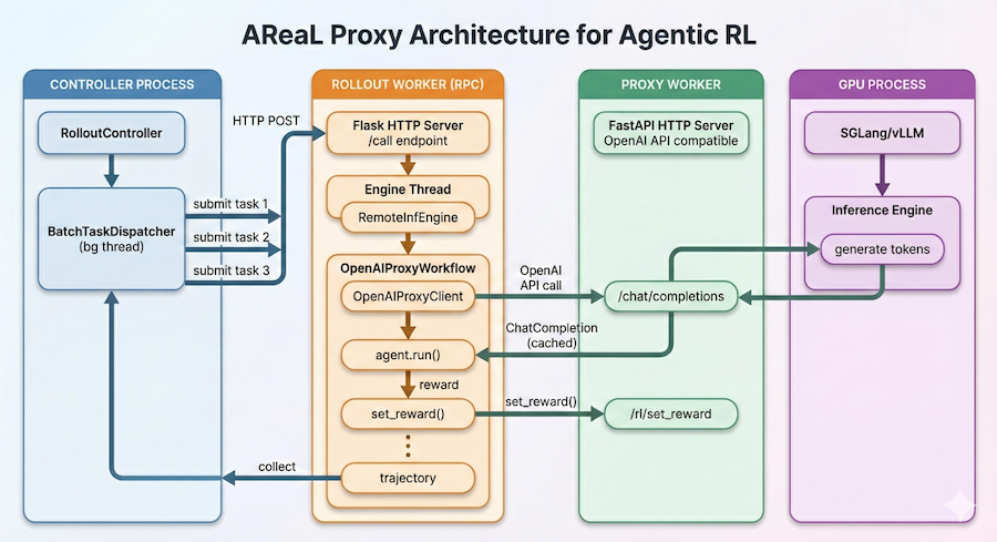 AReaL 是首个全异步训推解耦的大模型强化学习训练系统,能让 Agent 在真实任务交互中获得反馈、持续优化决策。此次发布的 v1.0 版本让任意 Agent 零改造接入 RL 训练成为现实——通过在智能体与训练系统之间加入 Proxy Worker 中转层,开发者只需修改一个请求地址即可接入训练。