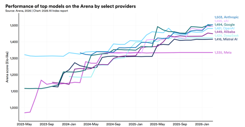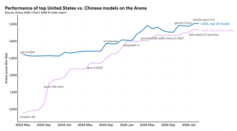 2023年初,OpenAI凭借其顶 级模型1322分的成绩占据明显领先优势,而谷歌当时仅为1117分。2024年全年,这一差距持续收窄,谷歌、Anthropic等公司相继推出性能更强的模型。截至2025年2月,深度求索(DeepSeek)曾短暂追平并超越了美国竞技场排名前列的模型。去年的报告中,排名前四的模型分差约为97分,而到2026年3月,前四名模型的分差已不足25分。