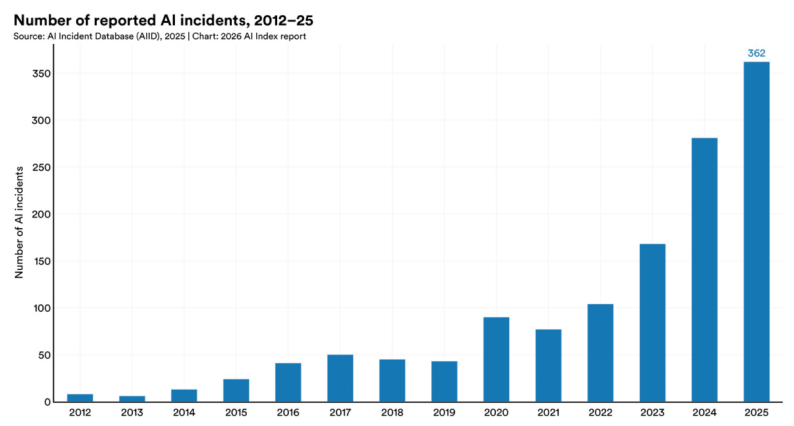 几乎所有领先的前沿AI模型开发者都会报告能力基准测试的结果,但关于负责任AI基准测试的报告仍不完整。已记录的AI事件从2024年的233起上升至362起。更具挑战性的是,最新研究发现,改善一个负责任AI维度(如安全性)可能会导致另一个维度(如准确性)的下降。