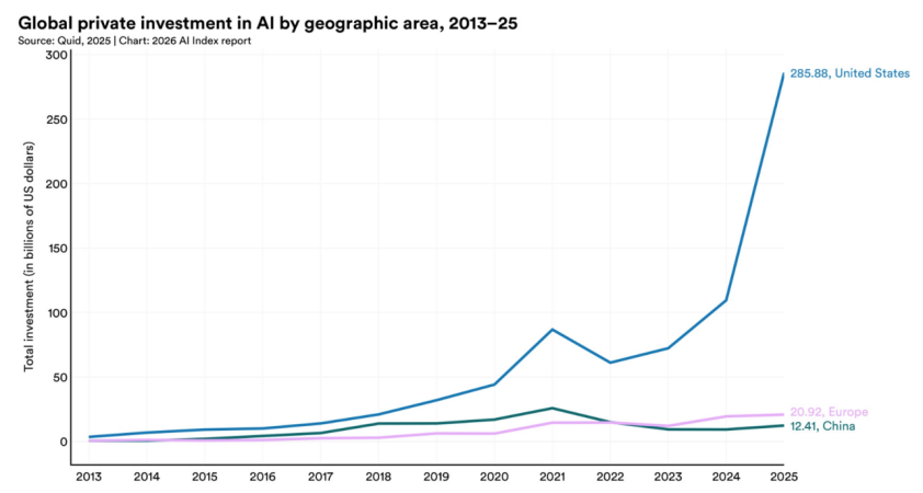 2025年,美国私营AI投资达到2859亿美元,是中国的124亿美元投资额的23倍以上——仅看私营投资数据可能会低估中国的总AI支出,因为中国还有政府指导基金。在创业活动方面,美国同样处于领先地位,2025年获得新融资的AI公司达1,953家,是排名第二国家的10倍以上。然而,自2017年以来,移居美国的AI研究人员和开发人员数量下降了89%,仅去年一年就减少了80%。