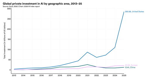 美国仍产出更多顶尖AI模型和影响更大的专利,而中国在论文发表量、被引用次数、专利产出及工业机器人安装量方面处于领先地位。韩国在创新密度方面表现突出,人均AI专利数量位居世界第 一。