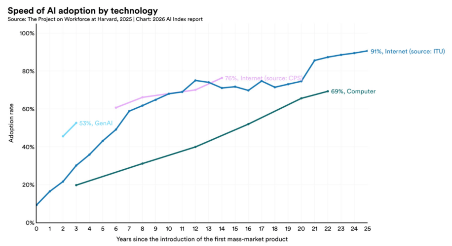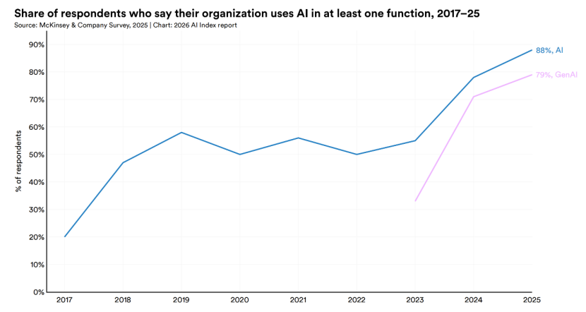 2025年,超过90%的知名前沿模型由行业开发,其中部分模型在博士级科学问题、多模态推理及竞赛数学领域已达到或超越人类基准水平。在关键编程基准测试——SWE-bench Verified中,性能在短短一年内从60%跃升至接近100%。企业采用率达到88%,五分之四的大学生现在使用生成式AI。