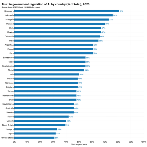 在AI对工作方式的影响方面,73%的专家预期其将产生积极影响,而公众中持此观点的仅占23%,两者存在50%的差距。在AI对经济和医疗保健的影响方面,也出现了类似的分歧。在全球范围内,对政府监管AI能力的信任度各不相同。在受访国家中,美国民众对其政府监管AI能力的信任度最低,仅为31%。在全球范围内,相比美国或中国,欧盟在有效监管AI方面更受信任。
