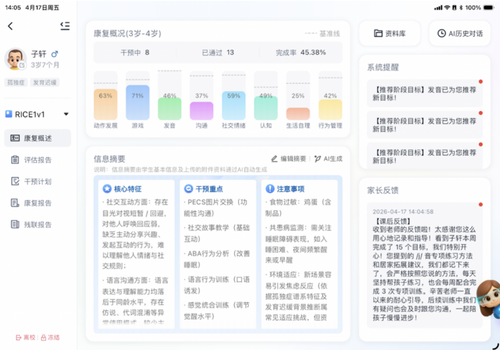 在个性化教学与康复干预方面,RICE AI能够动态更新学科教案、康复训练记录,快速生成生活适应、学科教学等目标,还能根据教学数据提示教学调整,自动生成成效反馈,让康复干预更具针对性和科学性。