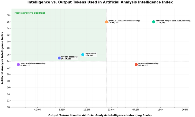 在Token消耗测试中,Ling-2.6-flash只用1/10的消耗完成同等评测。根据权威三方评测机构Artificial Analysis的数据,该模型以15M output tokens实现了26分的Intelligence Index。作为对比,Nemotron-3-Super等模型要达到相近分数,消耗的token量超过110M。