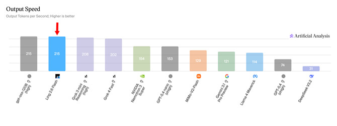 这种设计带来的直接好处就是硬件效率的显著提升。据蚂蚁百灵公布的数据,在4卡H20条件下,Ling-2.6-flash的推理速度最快可达340 tokens/s,Prefill吞吐达到Nemotron-3-Super的2.2倍。在Output Speed测评中,它以215 tokens/s的稳定输出速度位列同参数级别模型的第一梯队。