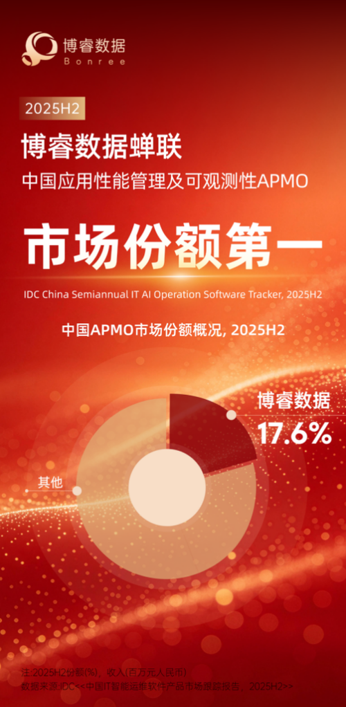 近日,国际数据公司(IDC)发布《中国IT智能运维软件市场跟踪报告,2025H2》(以下简称“报告”)。报告数据明确显示,2025年下半年,博睿数据(股票代码:688229)以17.6%的市场占有率稳居中国应用性能监控及可观测性(APMO)市场榜首,2025全年,博睿数据以19.8%的市场占有率成功实现中国APMO市场的断层领先,再次印证了其在智能可观测赛道的绝对核心竞争力与行业引领地位,也标志着中国本土可观测性企业已形成强大的市场主导力。这一亮眼成绩的背后,是市场与万千客户对博睿数据综合实力、技术创新能力及服务品质的高度认可,更是公司18年来深耕可观测与智能运维领域、坚守客户价值、持续迭代创新的必然结果。